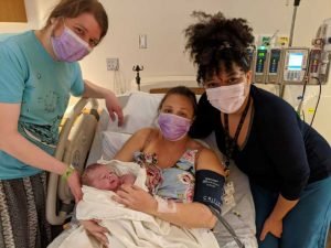 Just over 40 years later, we welcomed milestone baby number 13,000 on March 28, 2020, pictured here with proud parents Briggette and David, and LWC midwife, Autumn Nelson, CNM.